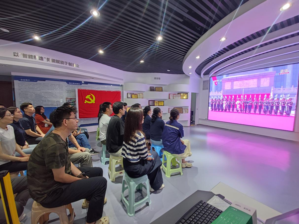 智能裝配事業(yè)部職工在項(xiàng)目現(xiàn)場(chǎng)收看大會(huì)直播